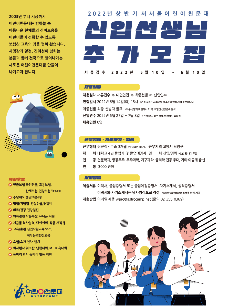 2022년 상반기 신입선생님 추가모집 공고 [서서울어린이천문대] - 마감