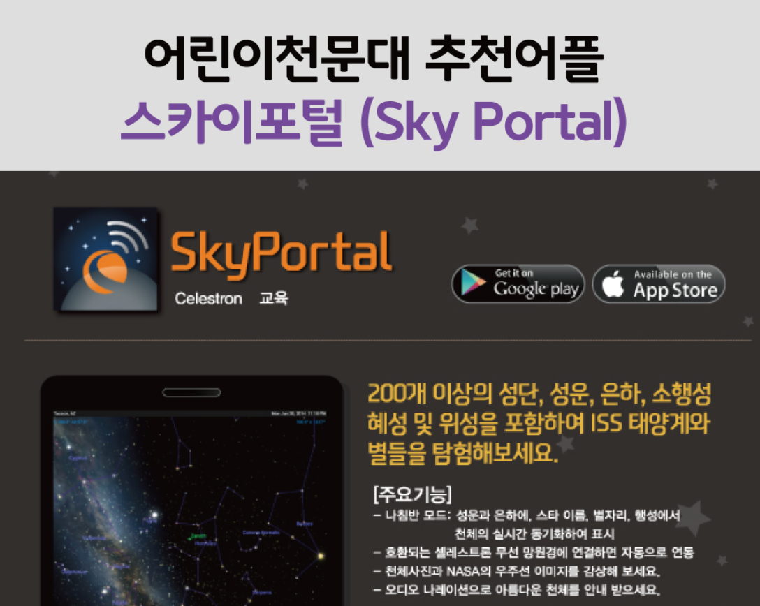 바로 Celestron(셀레스트론) 이라는 망원경 회사에서 직접만든~ 아이들과 어른들 모두를 위한 별자리 프로그램, Sky Portal (스카이포털) 입니다! |