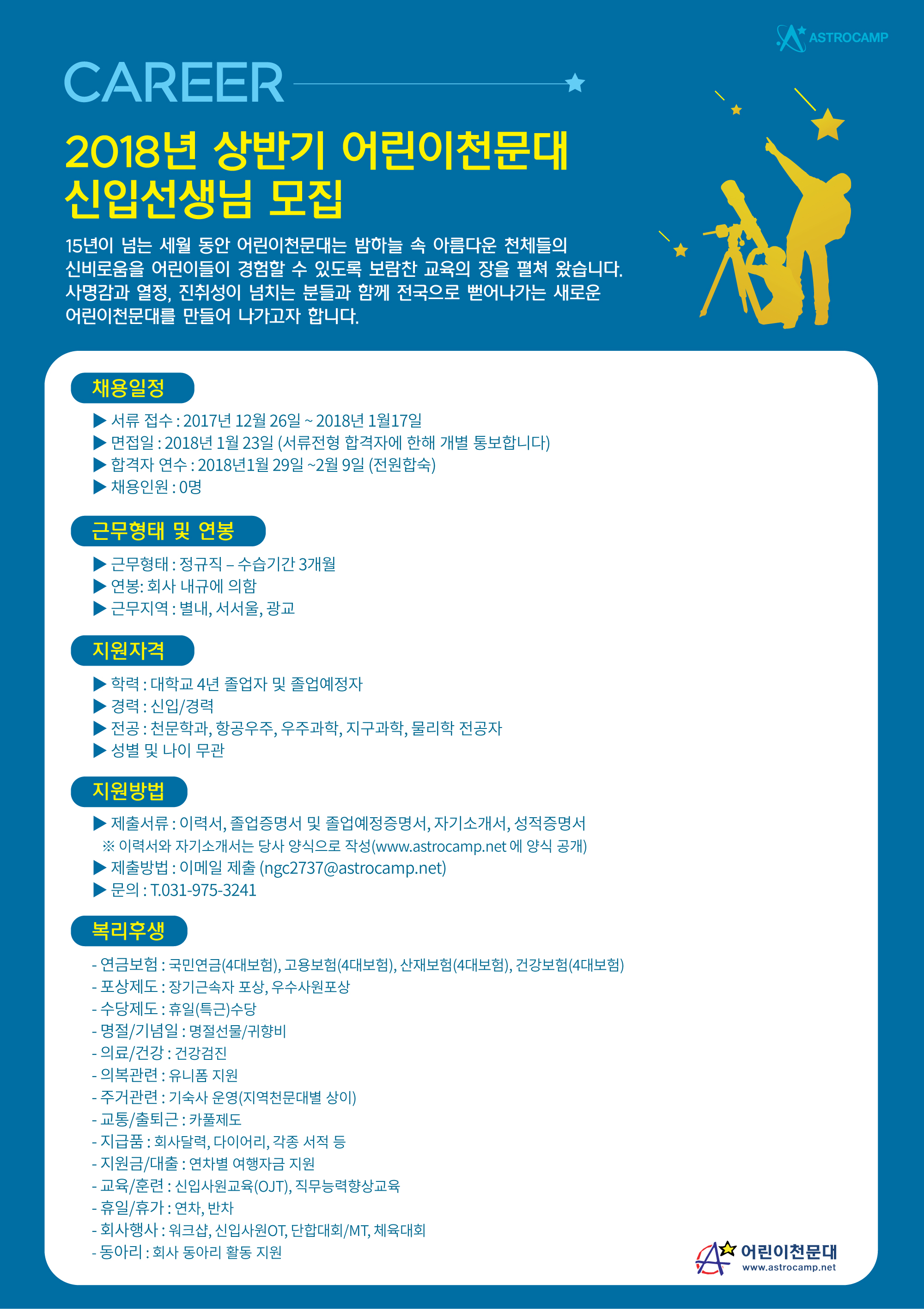 어린이천문대에서 2018년 상반기 신입선생님을 모집합니다. 열정과 진취성이 뛰어난 분들의 많은 관심 부탁드립니다.
