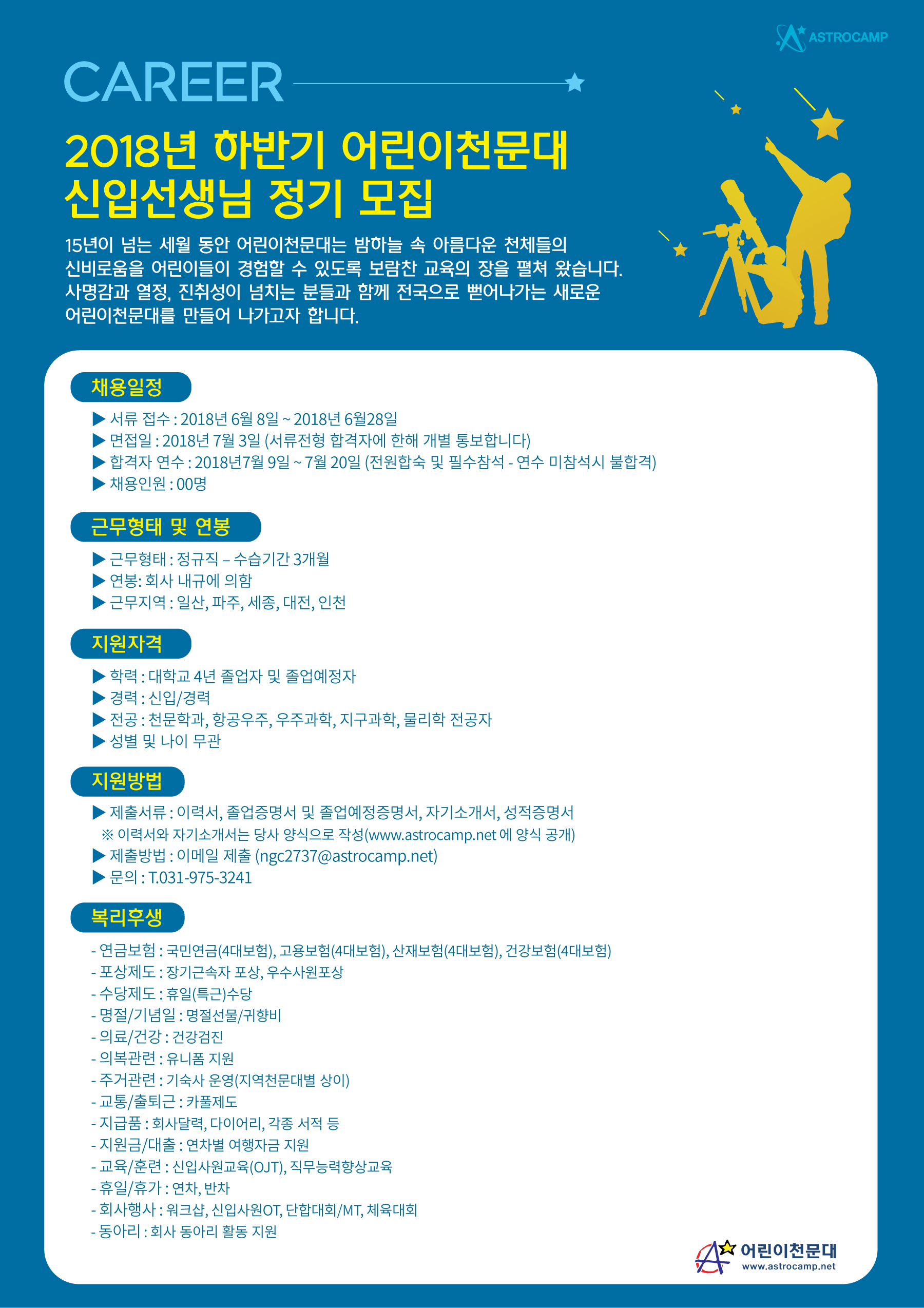 어린이천문대에서 2018년 하반기 신입선생님을 모집합니다. 열정과 진취성이 뛰어난 분들의 많은 관심 부탁드립니다.