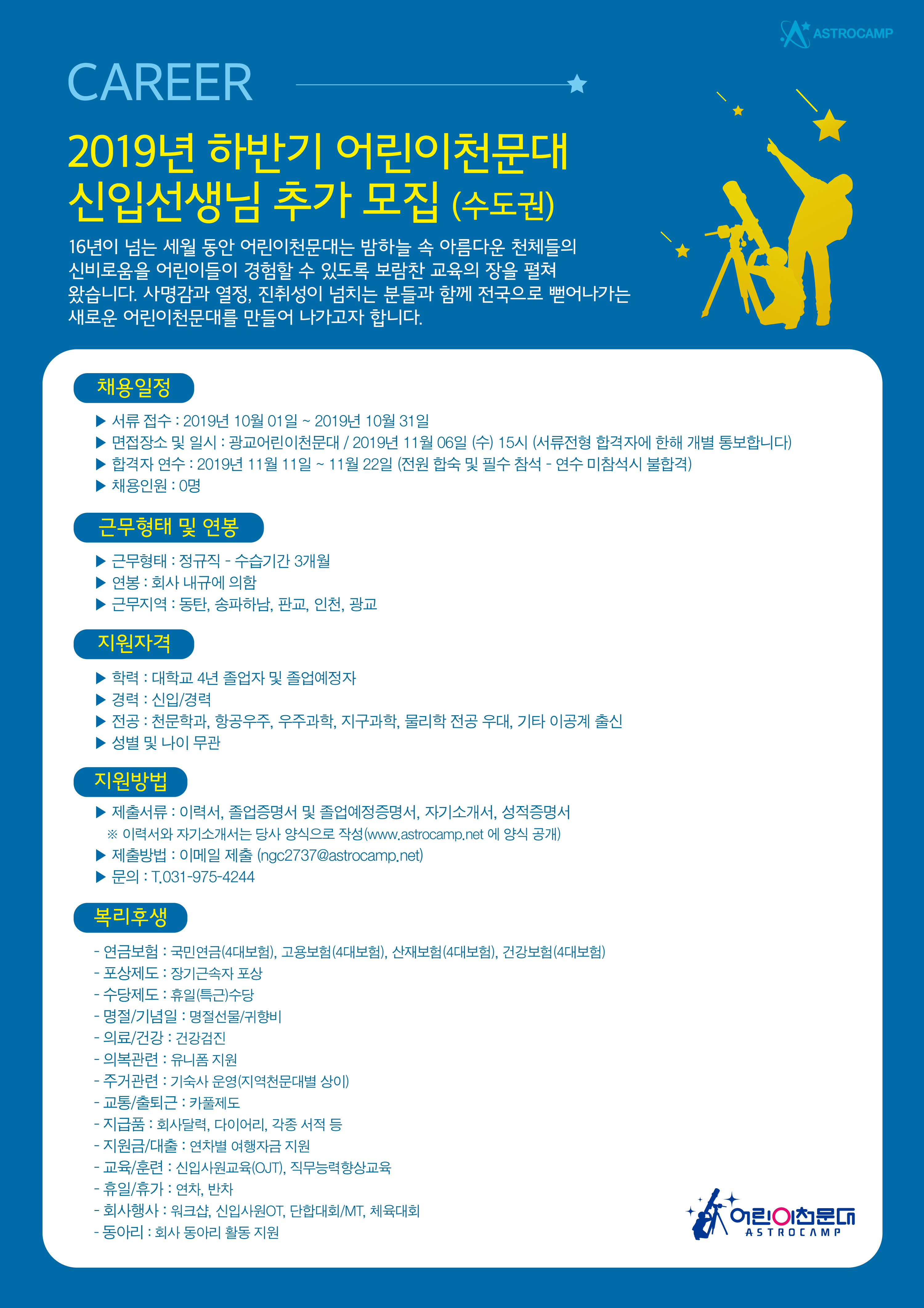 어린이천문대에서 2019년 하반기 신입선생님을 모집합니다. 열정과 진취성이 뛰어난 분들의 많은 관심 부탁드립니다.
