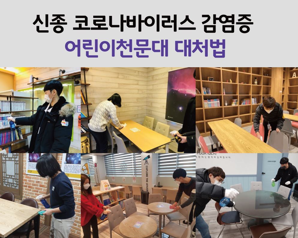 그래서 어린이천문대는 신종코로나바이러스가 발발한 설 연휴에 비상 대책회의를 진행하였고, 전 지점 모두가 신종 코로나 바이러스를 예방하기 위해 소독에 힘쓰고 있답니다.
