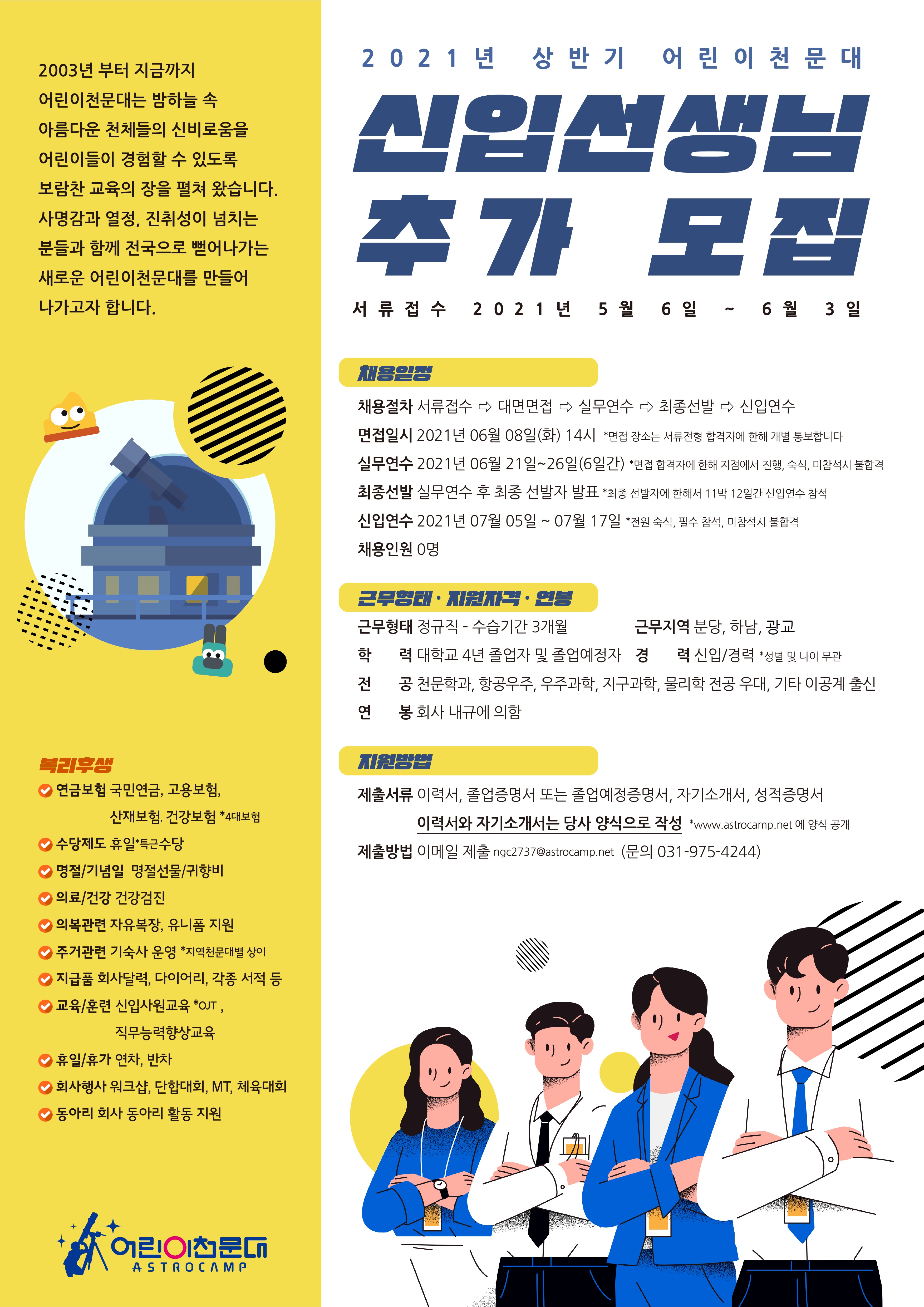어린이천문대에서 2021년 상반기 신입선생님을 추가모집합니다. 열정과 진취성이 뛰어난 분들의 많은 관심 부탁드립니다.