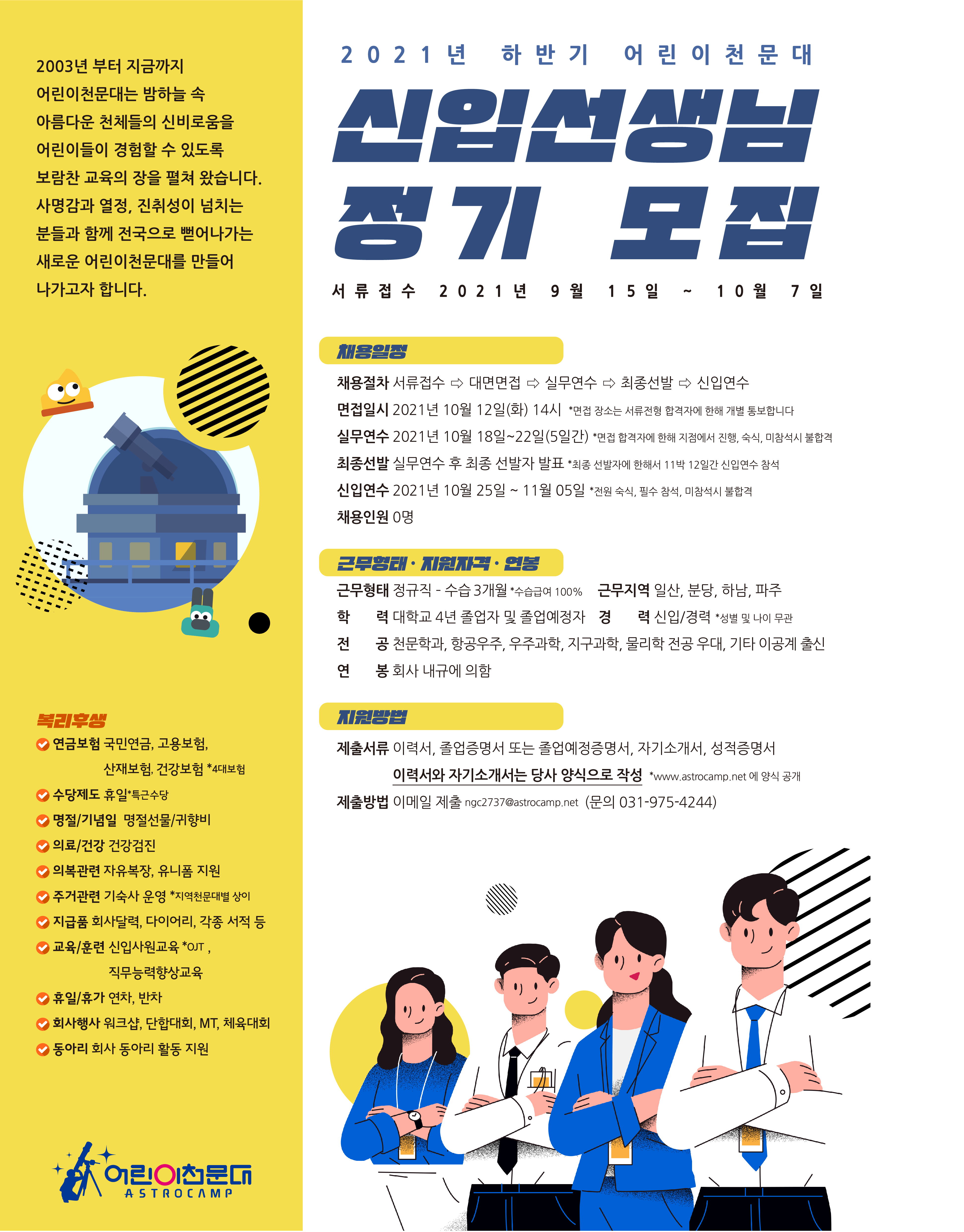 어린이천문대에서 2021년 하반기 신입선생님을 추가모집합니다. 열정과 진취성이 뛰어난 분들의 많은 관심 부탁드립니다.