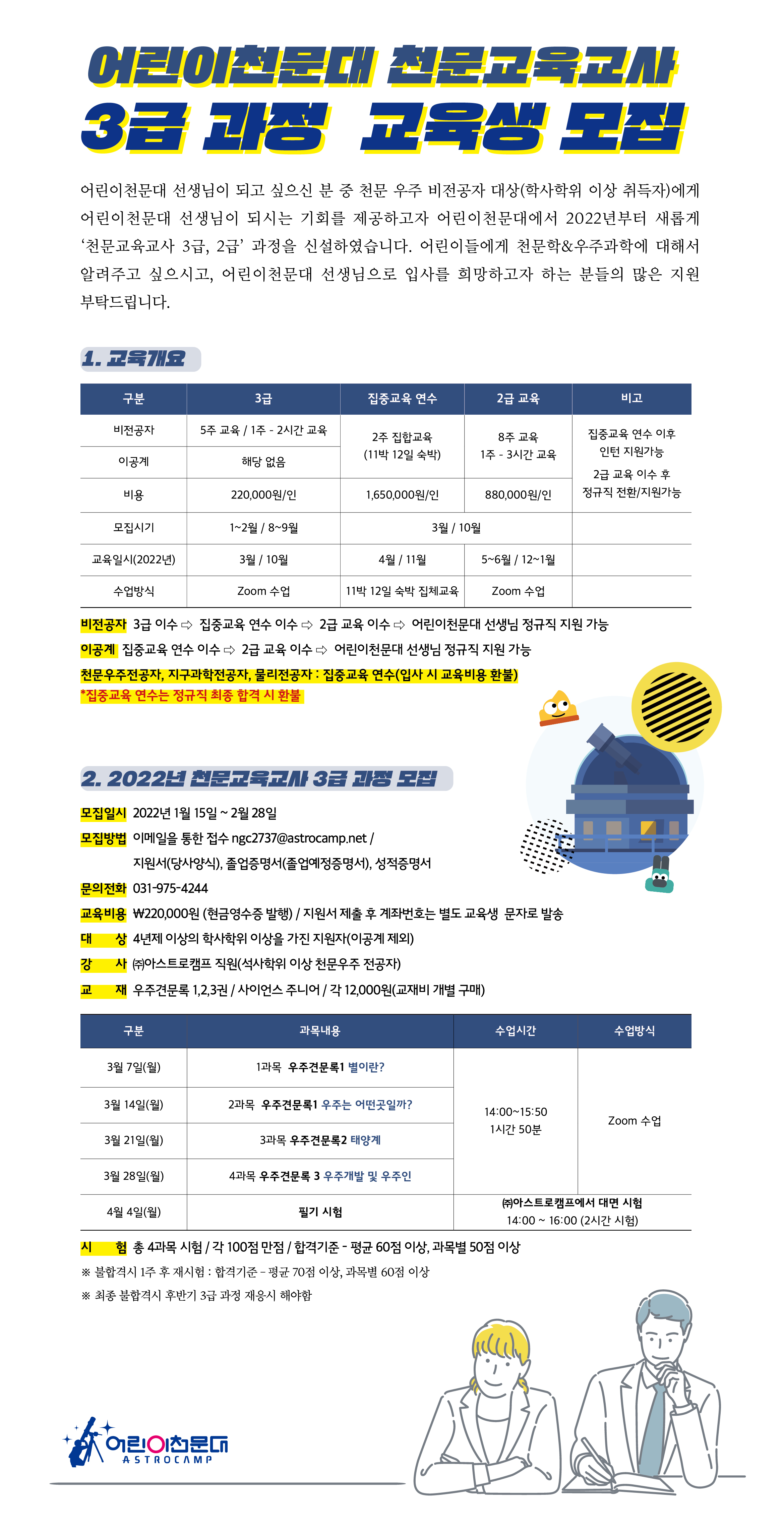 어린이천문대에서 2022년 천문교육교사 3급 과정 교육생을 모집합니다. 열정과 진취성이 뛰어난 분들의 많은 지원 바랍니다.