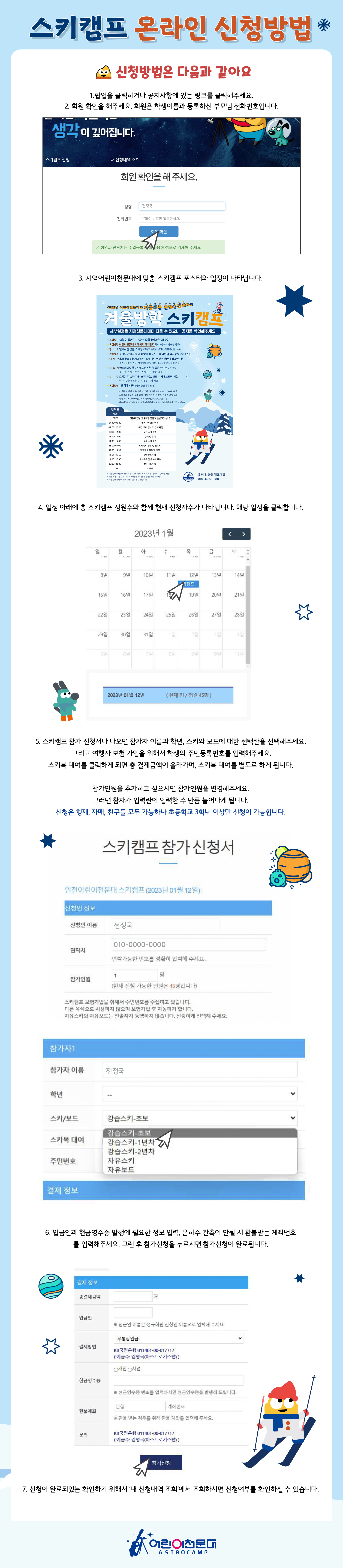 ※ 지점별 스키장 출발 일정이 상이합니다. 각 지점천문대의 공지사항을 통해 일정을 확인해주세요. ※ 아래의 예약방법을 숙지하신 후, 접수하시면 됩니다.