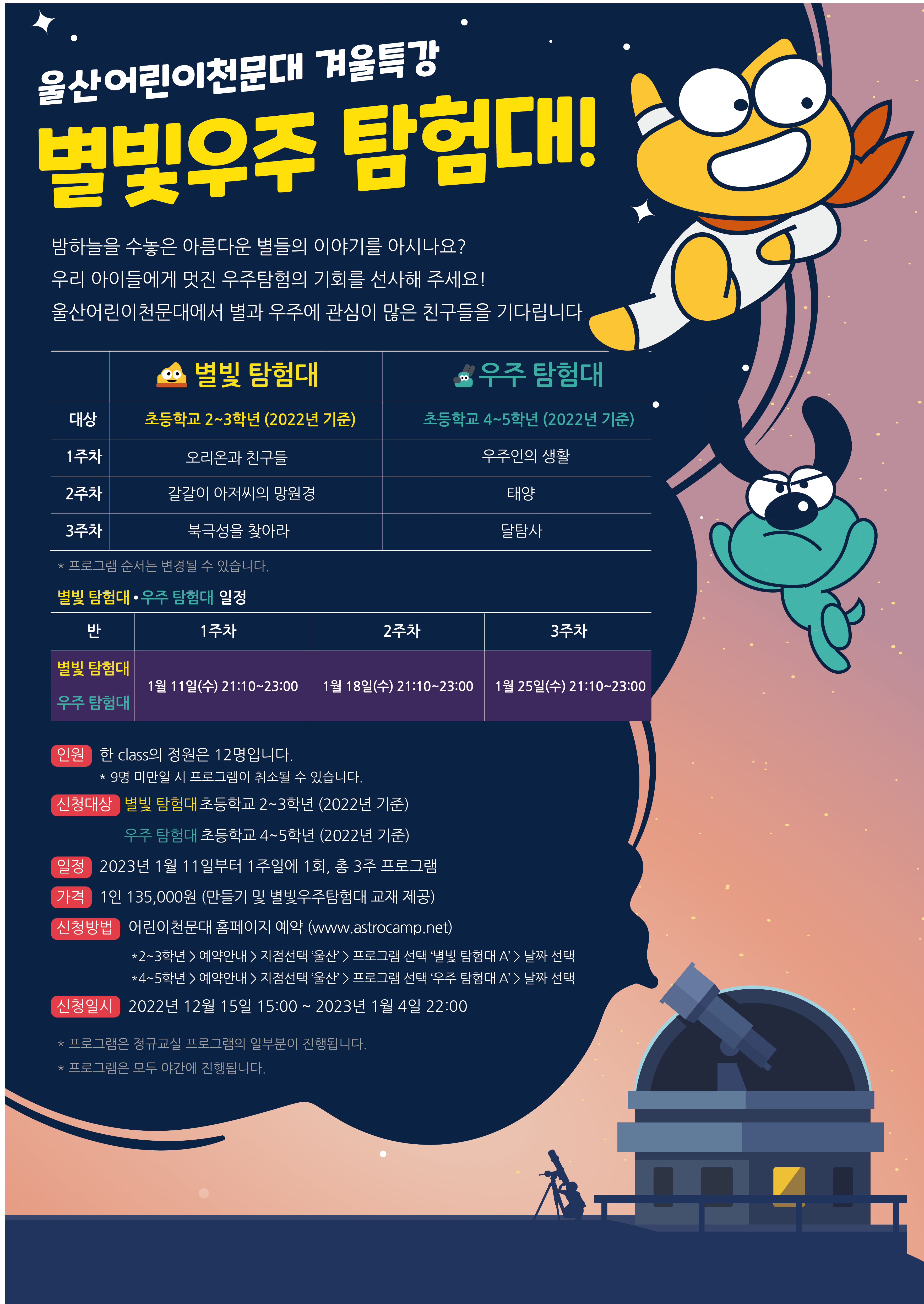 ※ 자세한 상담 및 문의는 울산어린이천문대 (052-212-0503)로 연락주시기 바랍니다. ※ 예약신청은 12월 15일(목) 19시부터 선착순으로 진행됩니다.