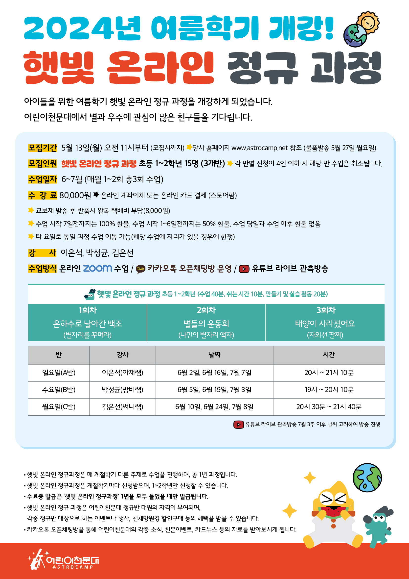 ※ 자세한 상담 및 문의는 어린이천문대 본사 (031-975-4244)로 연락주시기 바랍니다. ※ 신청은 24년 5월 13일(월) 오전 11시부터 선착순으로 진행됩니다. ※ 물품발송은 5월 27일(월)에 일괄적으로 진행됩니다.