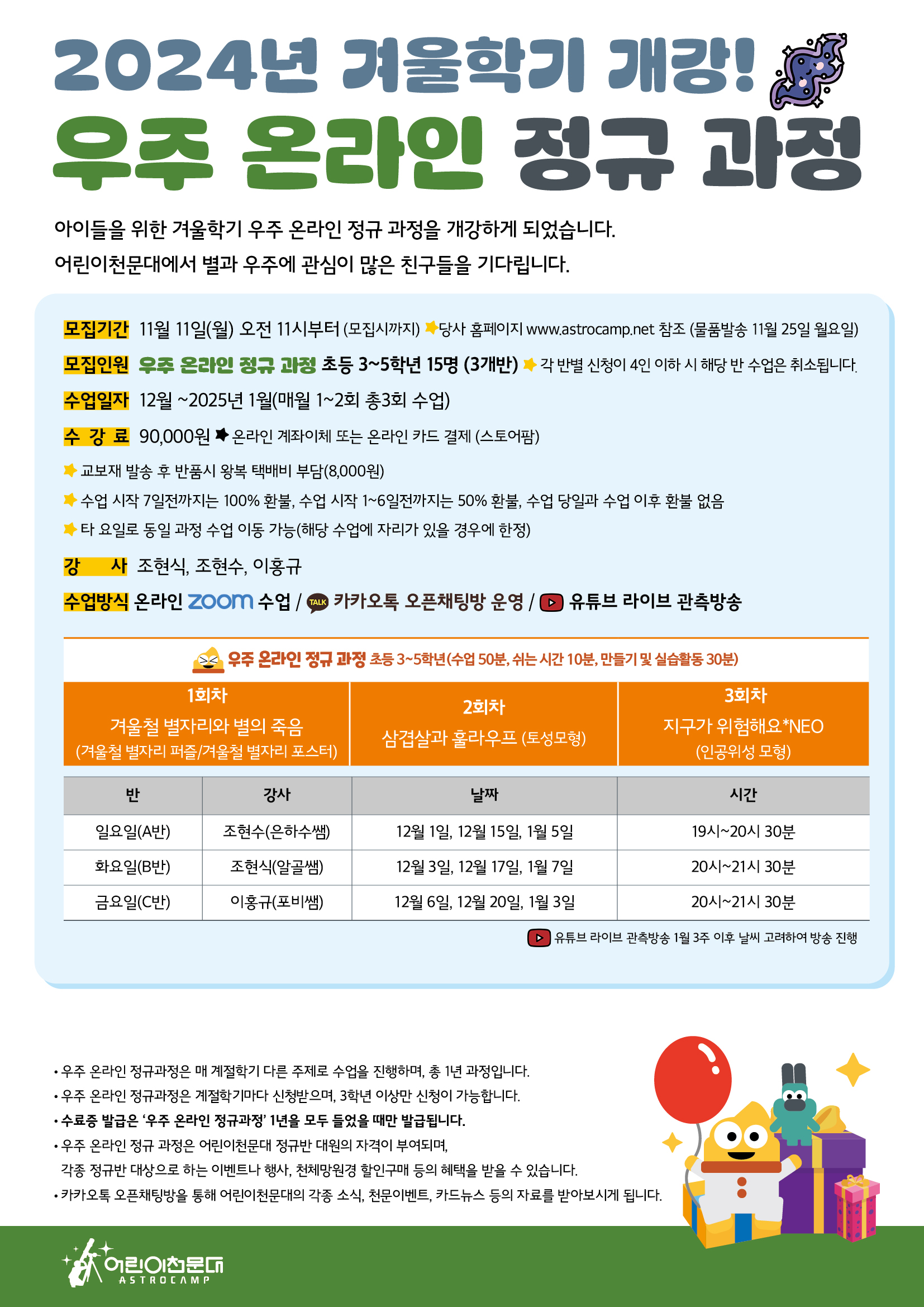 ※ 자세한 상담 및 문의는 어린이천문대 본사 (031-975-4244)로 연락주시기 바랍니다. ※ 신청은 24년 11월 11일(월) 오전 11시부터 선착순으로 진행됩니다. ※ 물품발송은 11월 25일(월)에 일괄적으로 진행됩니다.