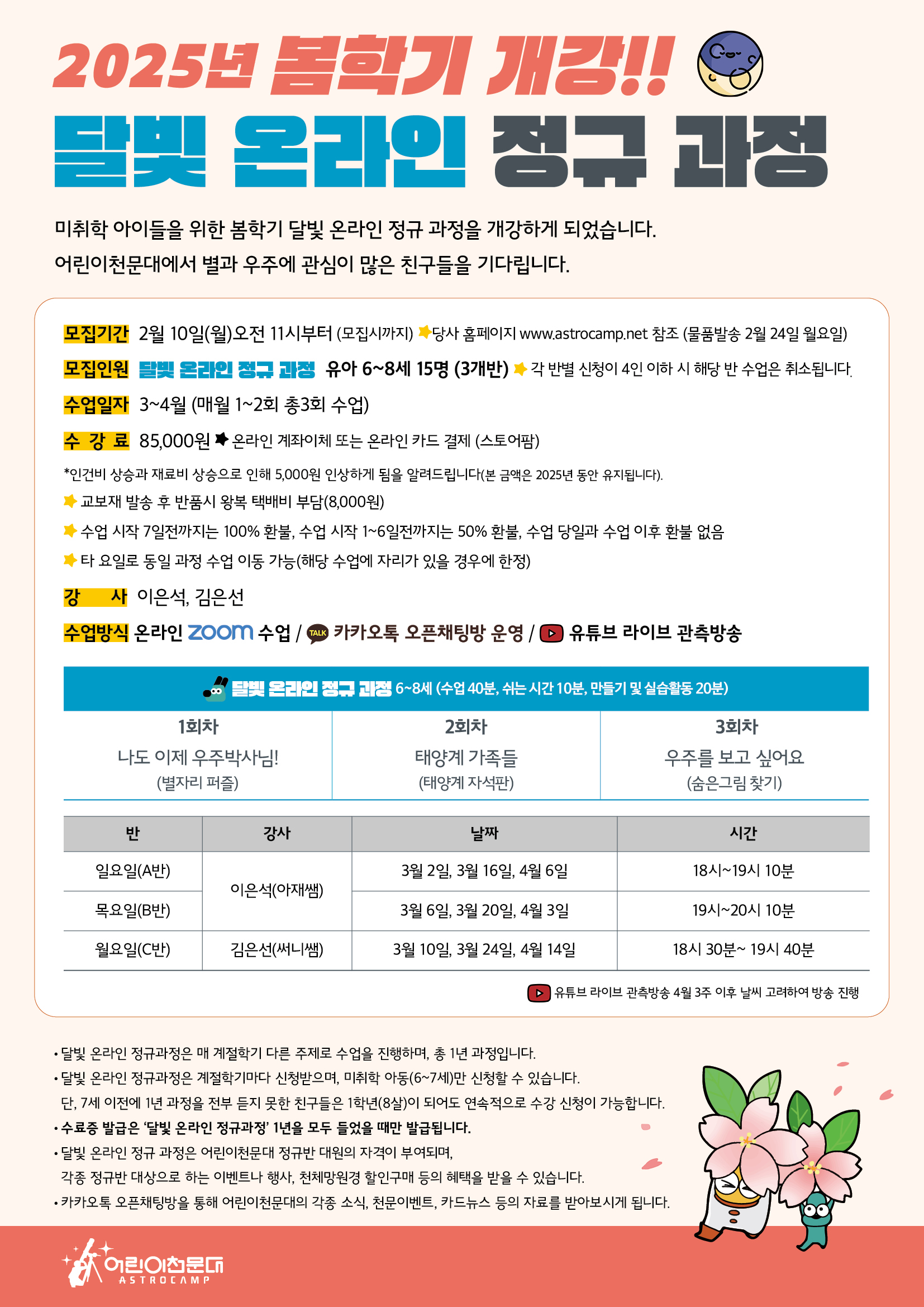 ※ 자세한 상담 및 문의는 어린이천문대 본사 (031-975-4244)로 연락주시기 바랍니다. ※ 신청은 2월 10일(월) 오전 11시부터 선착순으로 진행됩니다. ※ 물품발송은 2월 24일(월)에 일괄적으로 진행됩니다.