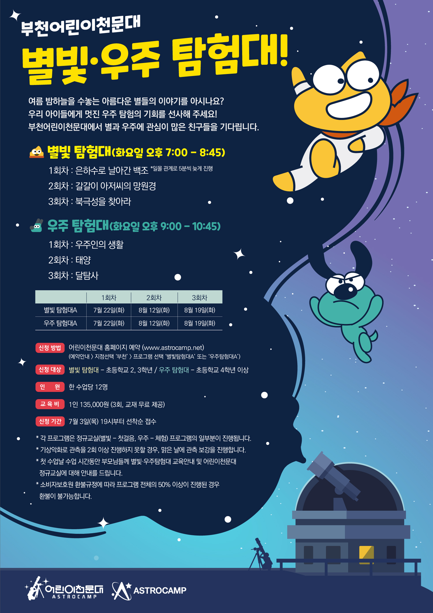 ※ 자세한 상담 및 문의는 부천어린이천문대 (032-677-3245)로 연락주시기 바랍니다. ※ 예약신청은 7월 3일(목) 19시부터 선착순으로 진행됩니다.