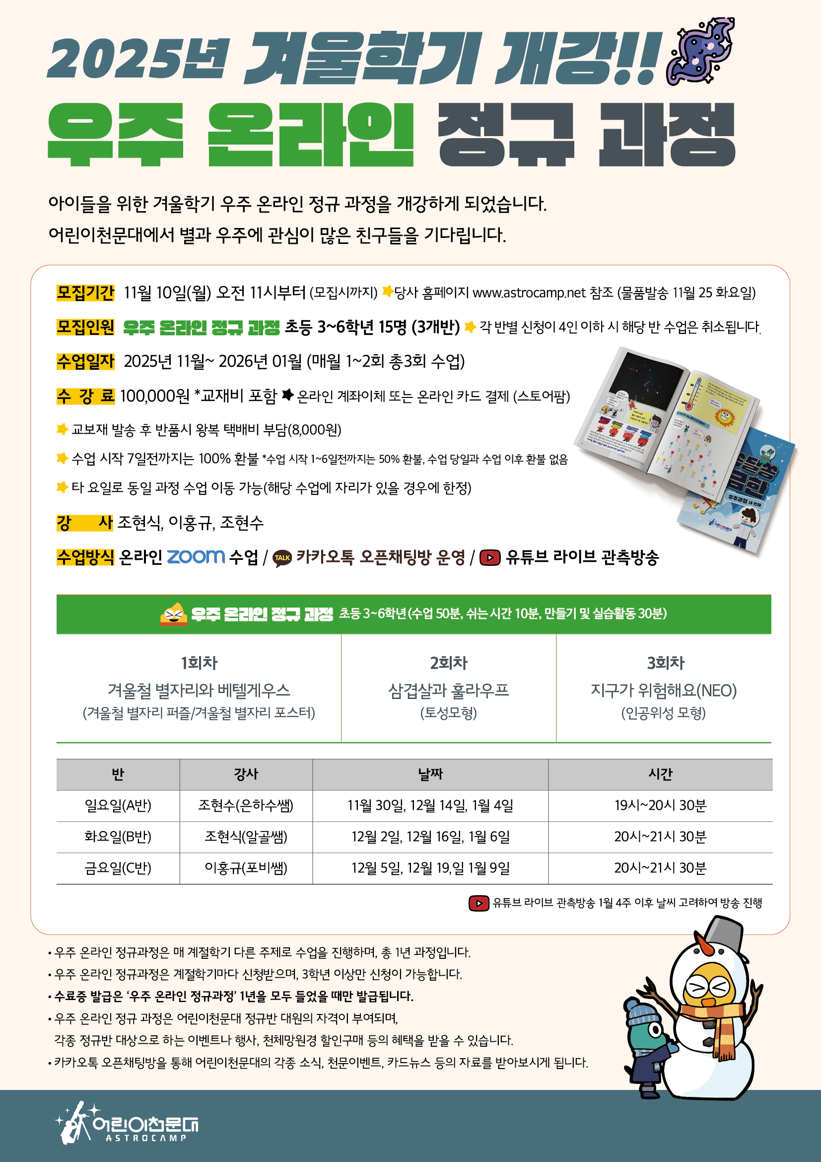 ※ 자세한 상담 및 문의는 어린이천문대 본사 (031-975-4244)로 연락주시기 바랍니다. ※ 신청은 11월 10일(월) 오전 11시부터 선착순으로 진행됩니다. ※ 물품발송은 11월 25일(화)에 일괄적으로 진행됩니다.