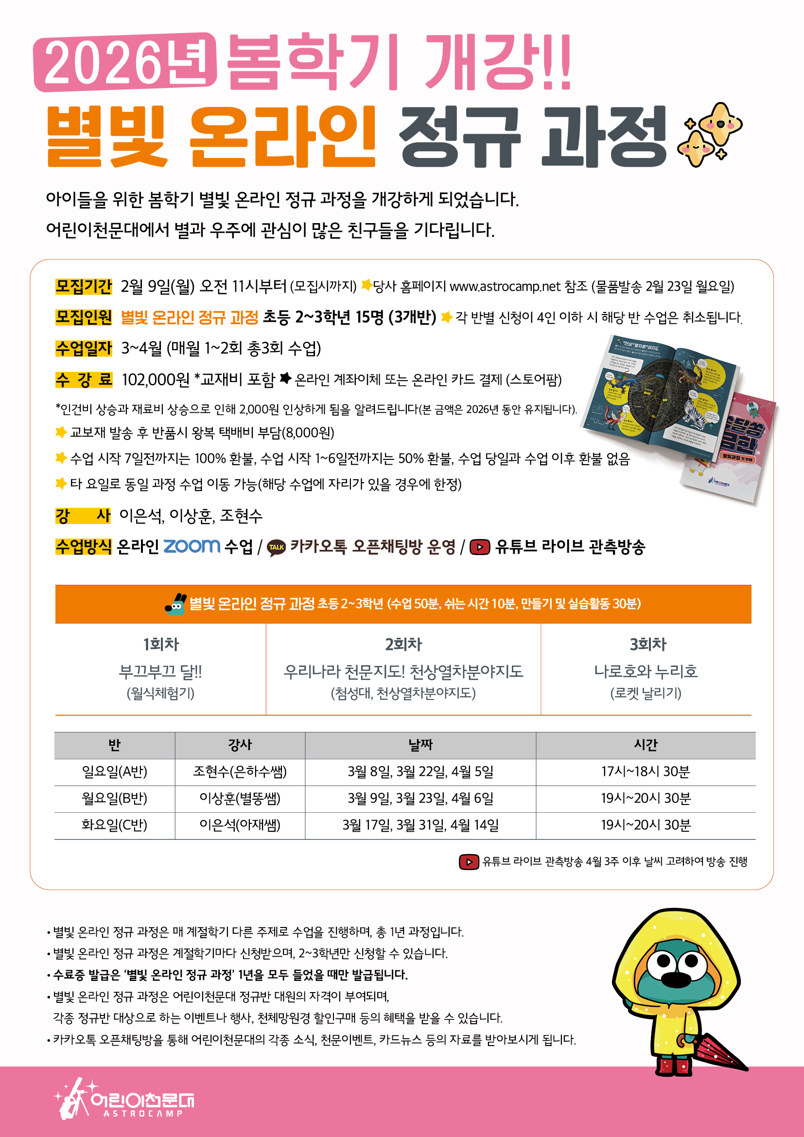※ 자세한 상담 및 문의는 어린이천문대 본사 (031-975-4244)로 연락주시기 바랍니다. ※ 신청은 2월 9일(월) 오전 11시부터 선착순으로 진행됩니다. ※ 물품발송은 2월 23일(월)에 일괄적으로 진행됩니다.