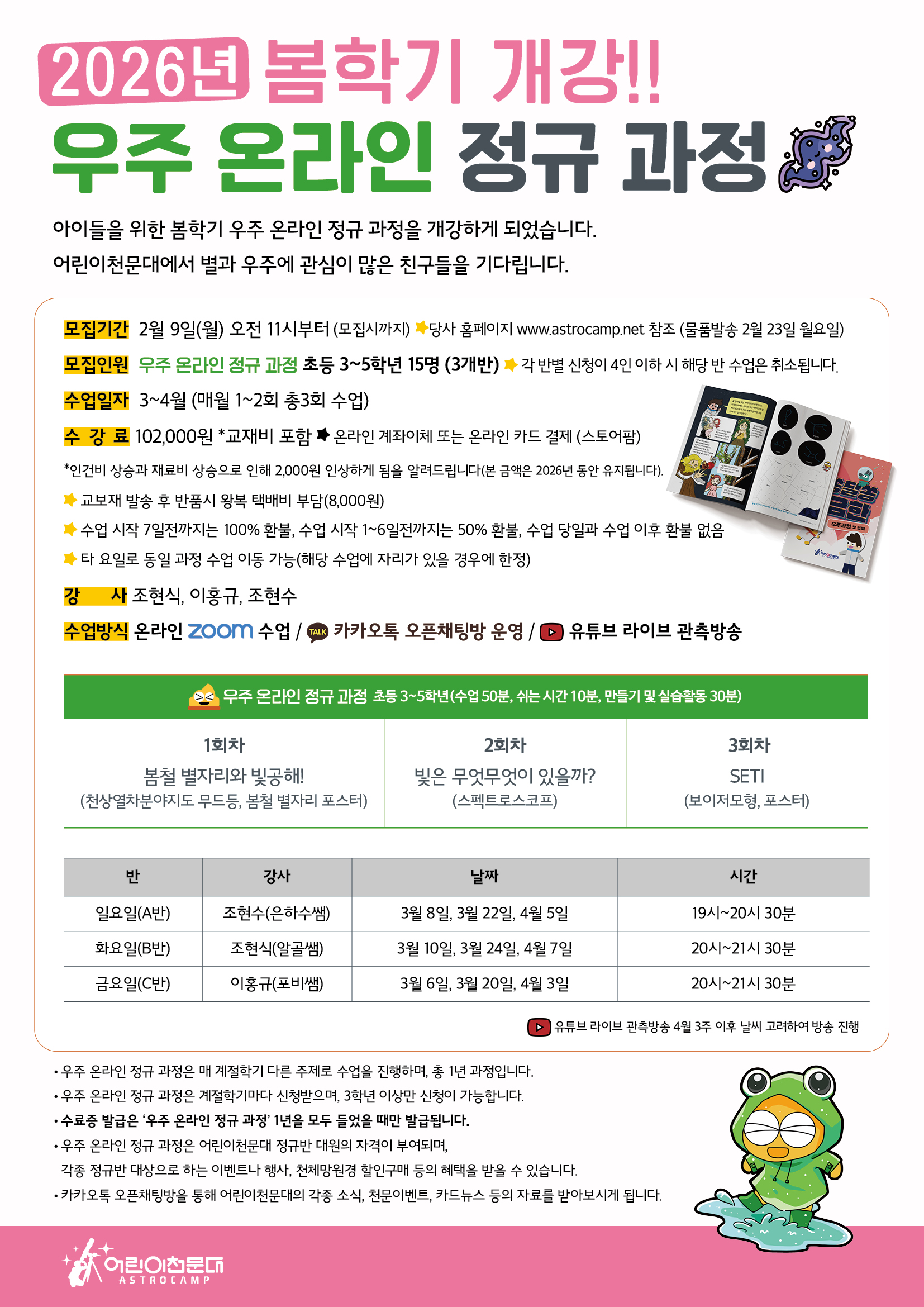 ※ 자세한 상담 및 문의는 어린이천문대 본사 (031-975-4244)로 연락주시기 바랍니다. ※ 신청은 2월 9일(월) 오전 11시부터 선착순으로 진행됩니다. ※ 물품발송은 2월 23일(월)에 일괄적으로 진행됩니다.