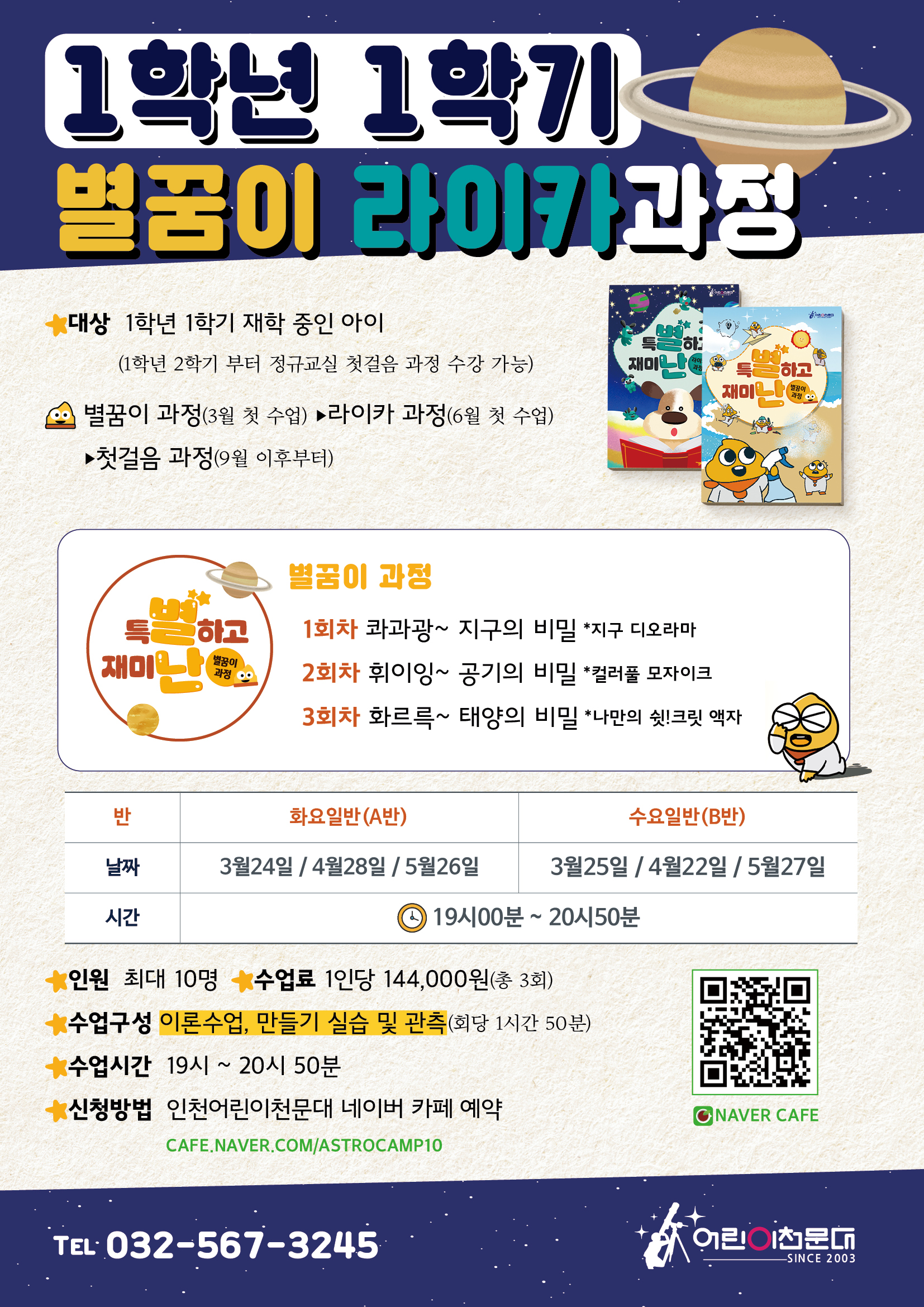 ※ 자세한 상담 및 문의는 인천어린이천문대 (032-567-3245)로 연락주시기 바랍니다. ※ 예약신청은 2월 24일 20시부터 인천어린이천문대카페 게시물 댓글로 선착순으로 진행됩니다.